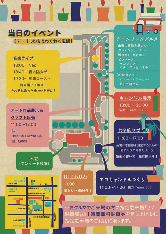 7月4日(土曜日)朝11時から夜の8時まで、食と音楽と水と灯と芸術のこのイベント。済生館の横の親水広場全域を使って、開催いたします。お気軽にお問い合わせください。023-623-6625(柏倉)