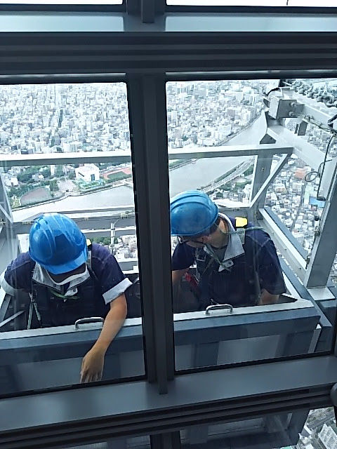 折角だから、展望台を見て回り、一番上はものすごく高い。意外と人も少ない。ここは別料金の為、修学旅行の生徒さんたちはいない。丁度、外側から、ガラス拭き作業をしているオジサンに出くわす。ヒーヒー!世の中にはこんな仕事もあるんだよね。当たり前だけど。