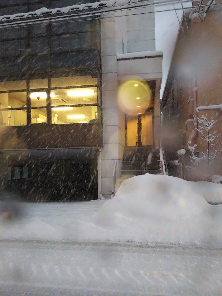 いつものダウンジャケットにニット帽。まだ暗い駐車場の雪を搔く。
