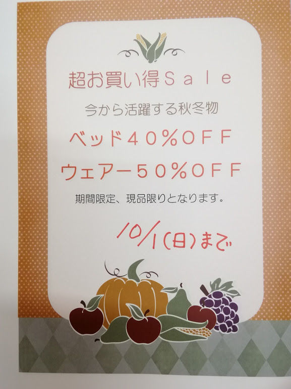 ※明後日まで去年の型のカドラー、ベッド、一部のお洋服をバーゲンしています。寒くなる前に是非。