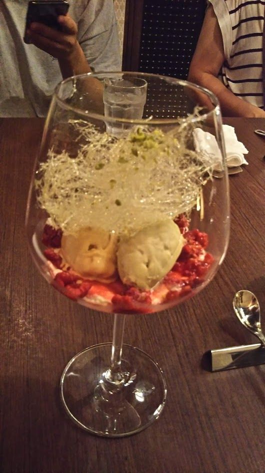 待つこと数分。これまた思い描いていたパフェとは、ちょっと違うものが。ピスタチオのアイスクリームと塩キャラメルのアイスクリーム、そして杏仁豆腐が底の方に引いてある。