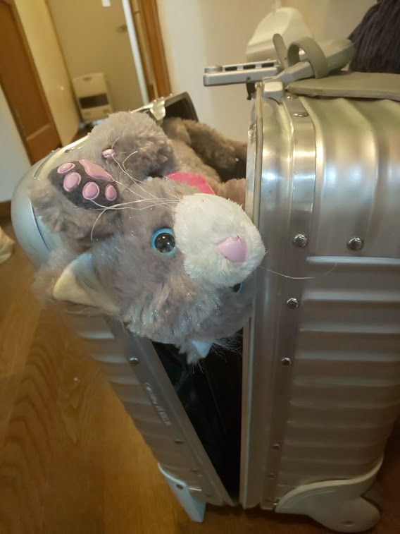 キャリーの中に相変わらず、ぬいぐるみ猫のコバヤシがいる。コヤツも場所を取るが、それなりに役に立っている(?)から、置いてゆく訳にも行くまい。(笑)