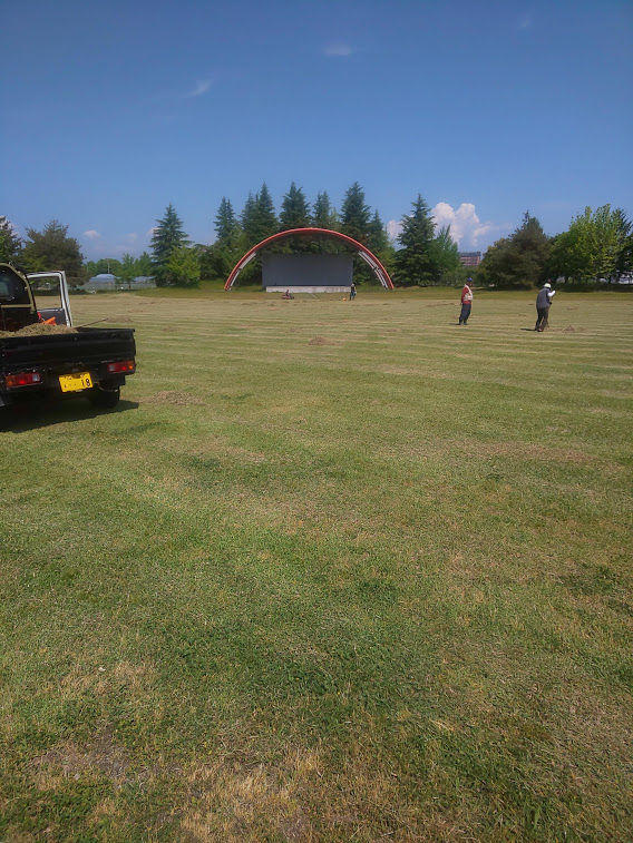 10人くらいで大きな敷地を草集めをする。草刈りは毎年の草刈り用のカートみたいなやつで、マリオのごとく刈ってゆく。