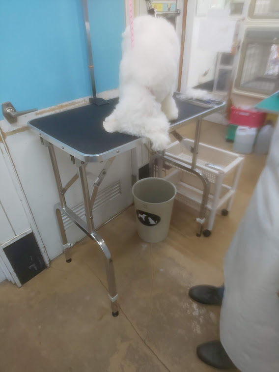 ※これはですね~。顔の毛を梳かされるのが、どうしても、いやらしくテーブルに顔面を埋める必死の抵抗。(笑)