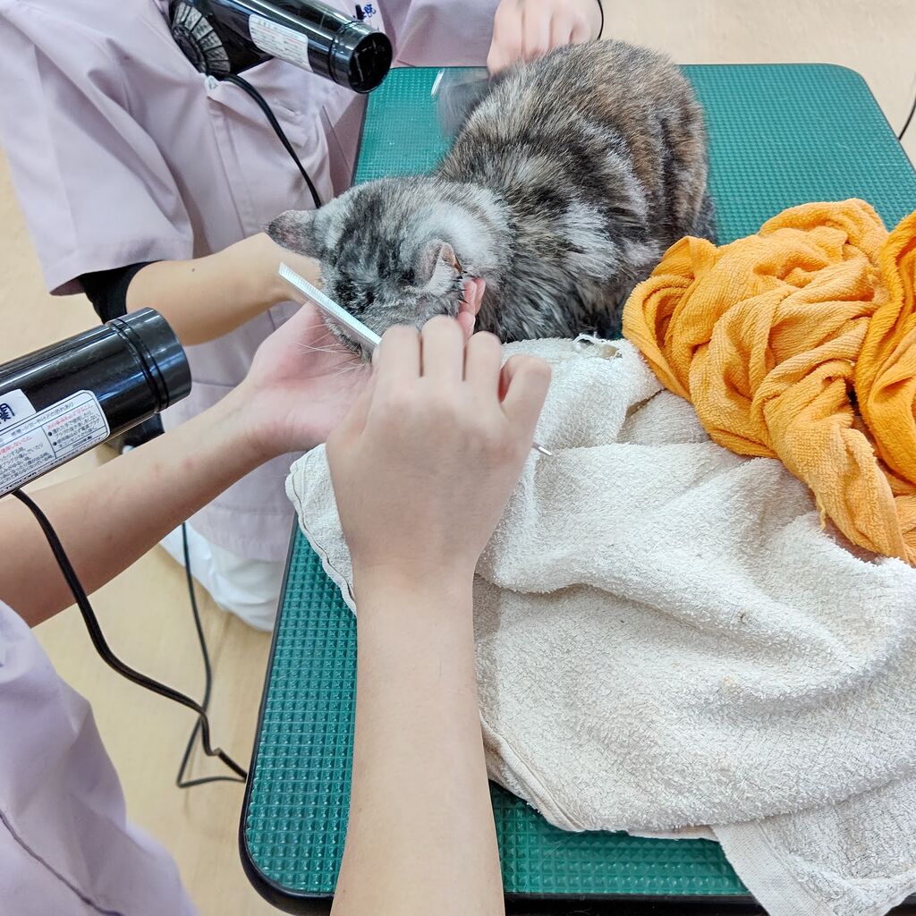 ご協力者の方の所のニャンコをシャンプーさせていただく。一年生なのでなかなか手こずっておりましたが、何とか時間内に終了。