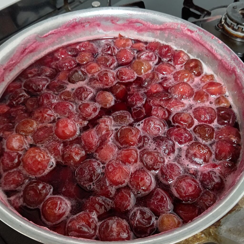 ゾラマメは、塩ゆで、ズッキーニはベーコンとマヨネーズで炒めて。大量のサクランボは、コンポートにして、ブランデーとキュラソーをかけておく。ラム酒が無かった。