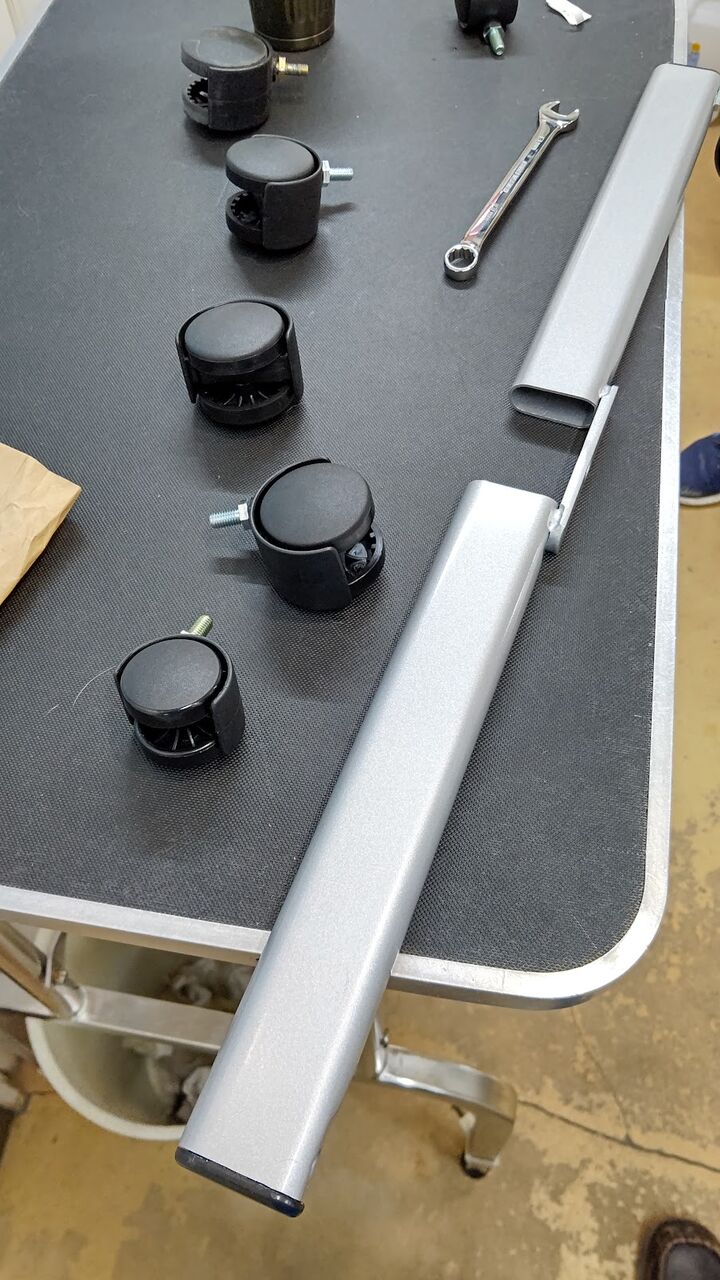 帰宅して猫を洗っていた奥さんのサポートなどをしていたら、先週末に突然金属疲労を起こして壊れた業務用のドライヤーのキャスター付きの土台の部分が入荷した。