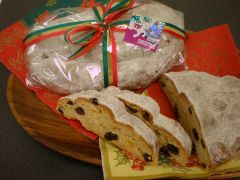 ドイツで親しまれているXmasケーキです。生イーストを使いラムレーズンとシトロンピール、オレンジピール、アーモンドスライス、レモンの皮のすりおろしを入れたバターたっぷりの薫り高いお菓子です。厚さ1㎝位にスライスしてお召し上がりください。可愛いサイズ、180gで600円です。是非一度おためしください。